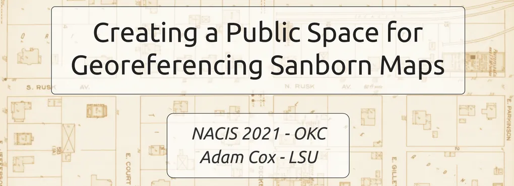 In October 2021 I attended my first (in-person) meeting of the North American Cartographic Information Society (NACIS), held that year in Oklahoma City. My presentation was titled Creating a Public Space for Georeferencing Sanborn Maps.