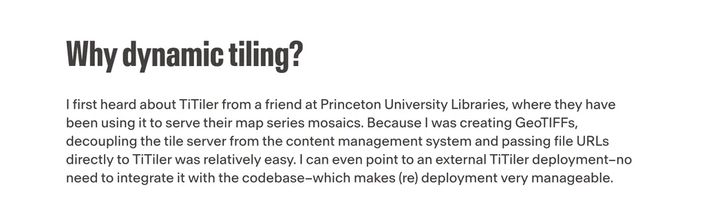 Working with Kiri and Sanjay from Development Seed, we put together this post for Dev Seed’s blog: Open Source Spotlight - Old Insurance Maps. This came about because Kiri saw my presentation at FOSS4G Southeast in Nashville last year, where I described how I had reworked OldInsuranceMaps.net to use TiTiler (open source software that Dev Seed created and maintains) for dynamic raster tiling, replacing GeoServer which had been incorporated into the platform from the beginning.