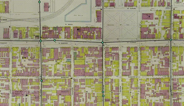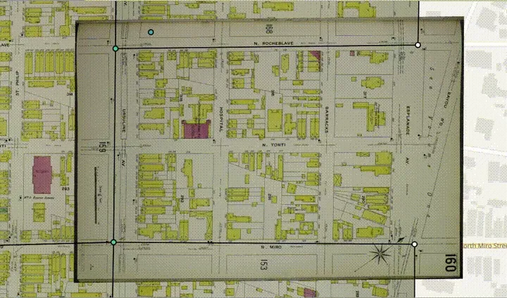 This is the historic French Quarter in New Orleans, as shown on 24 georeferenced pages from the Sanborn map, Vol. 2, 1908. As you can see, while each individual layer would look fine on its own, when they are all displayed together in a single web map the margins from each sheet overlap each other. This obscures information on adjacent sheets, and, generally speaking, looks very messy.